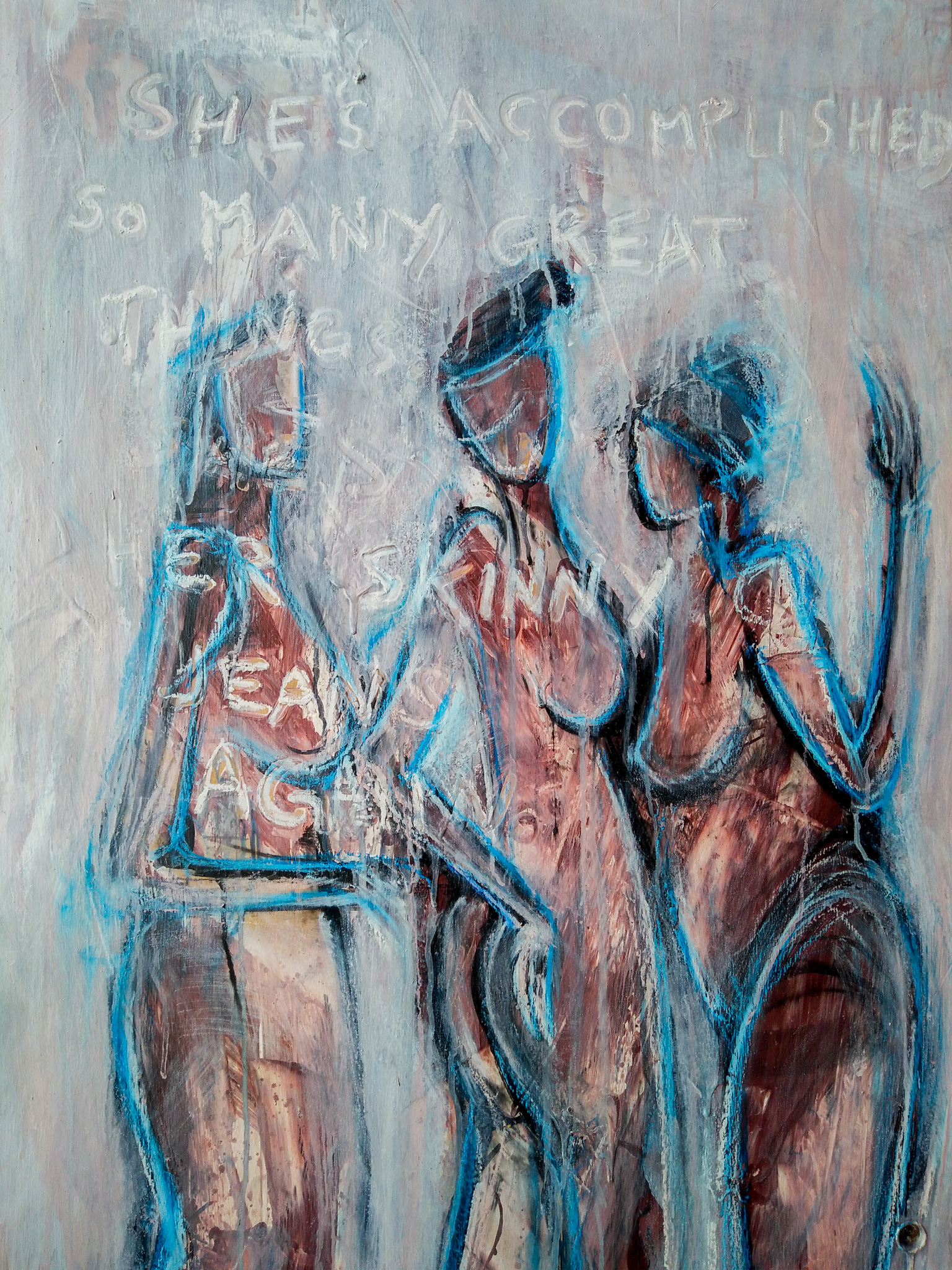 An original mixed media painting on panel wood sliding door. A piece about the female figure and the weight of her complexities within our society. This painting functioned as a sliding door across an installation wall for a solo gallery show I had in 2016.   household, ink, spray paint, oil pastel, acrylic and gesso…