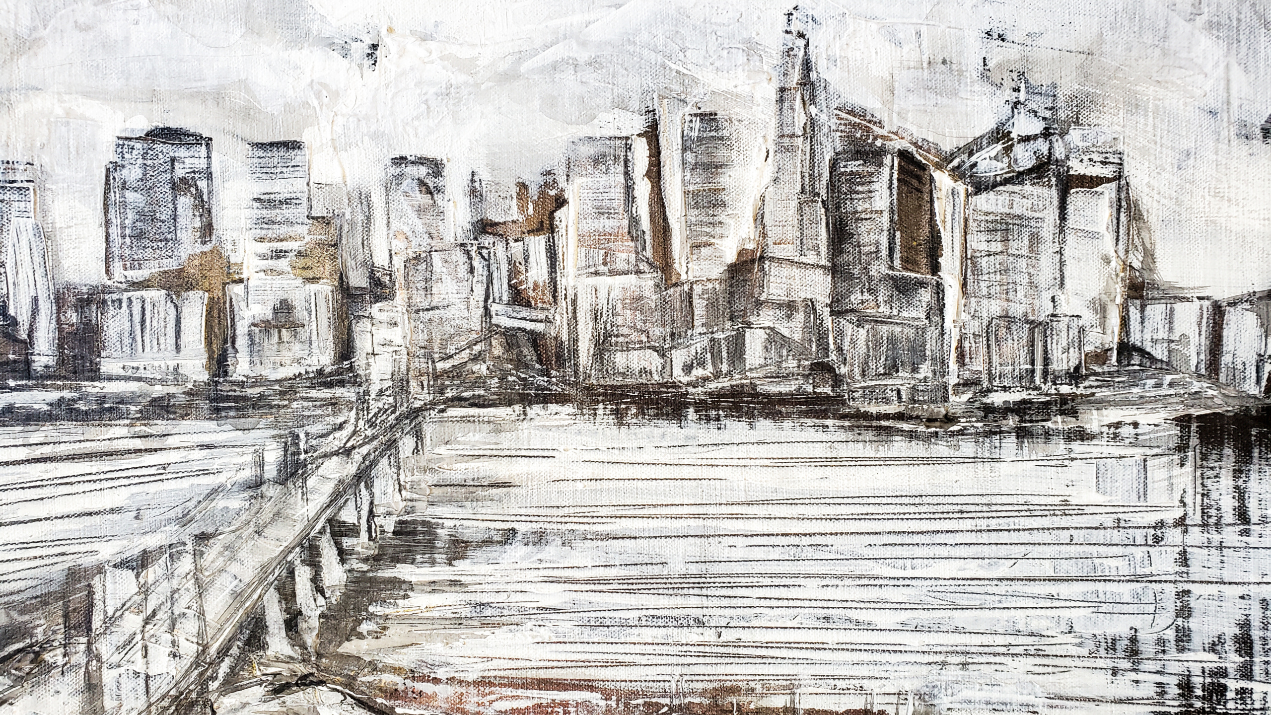 An original mixed media painting. The artwork has been in circulation since 2004. I have repainted this canvas as a new artwork on 3 separate occasions. The layers allowed for a complete white out with gesso and some palette knife work to create what is now, a San Francisco Bay scene from 2020. acrylic, ink,…