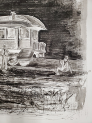 An original mixed media painting. “MEMORANDUM”  From then to now… so the story goes… The Memorandum Collection features ink and charcoal paintings which bring back to life photo negatives from early 1900’s America. The photo negatives tell a relatable story with room to breathe. The ink and charcoal bring the story to life with chaotic…