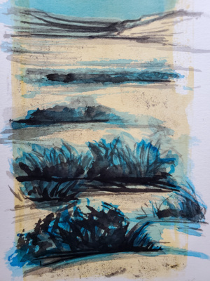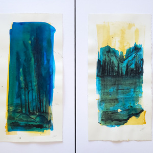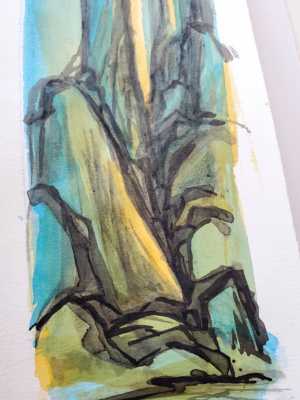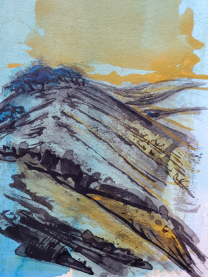$175.00An original painting on paper. An ongoing collection of visual notes and observations from my time spent in silence and solitude on mountains. ink and watercolor on stonehenge paper (natural) 6.5″ x 13″ unframed (this piece includes a white matte board @ 9″ x 16″.) (c) 2022